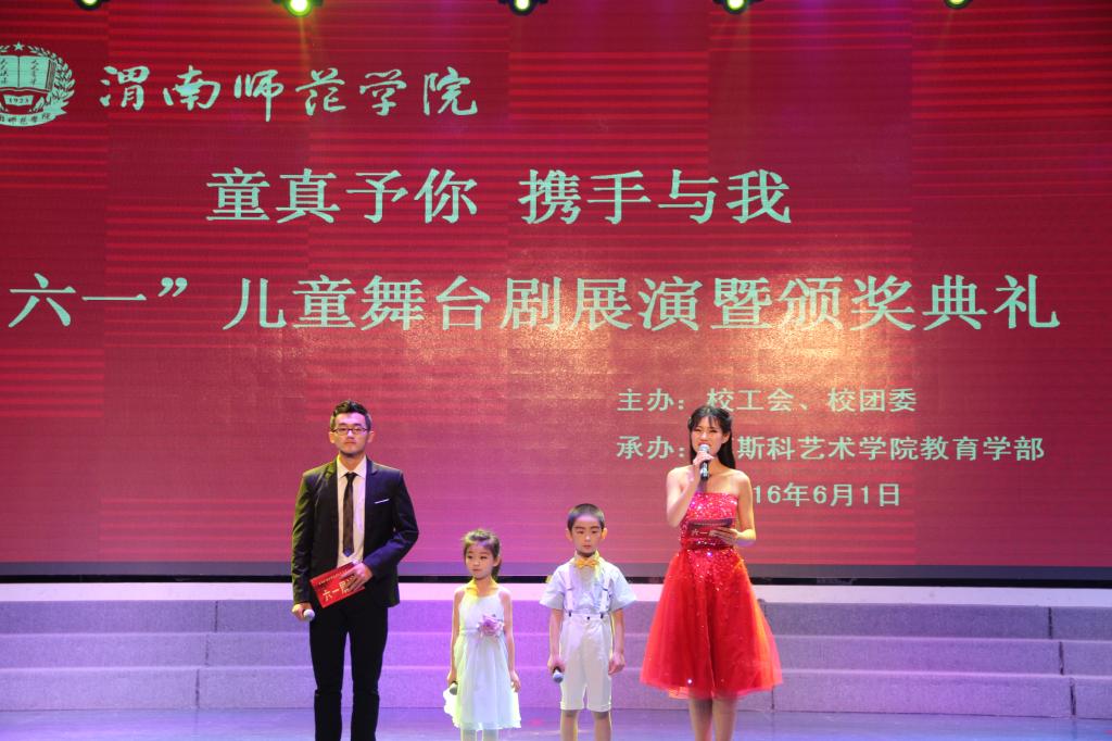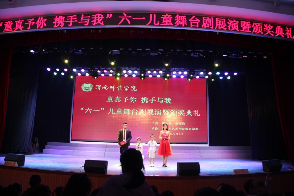 晚上,校工会、校团委、莫斯科艺术学院教育学部联合在陶然楼演艺厅举办了“童真与你、携手与我”儿童舞台剧六一展演活动。我校幼儿园的小朋友及教职工子弟观看了演出。参加演出的剧目选自我校莫斯科艺术学院教育学部“童真予你携手与我”儿童舞台大赛原创获奖剧目以及教育学部参加渭南市2016年“盛世花开童星绽放”六一儿童节文艺汇演获最佳表演奖的剧目《走丢的花花》。演出现场高潮迭起,掌声不断,被小观众们称之为“舞台上的动画片”。除了富有教育意义的剧情,精彩的表演,绚丽的舞台布景,教育学部的学生还将亲手制作的手工作品赠送给小朋友们。